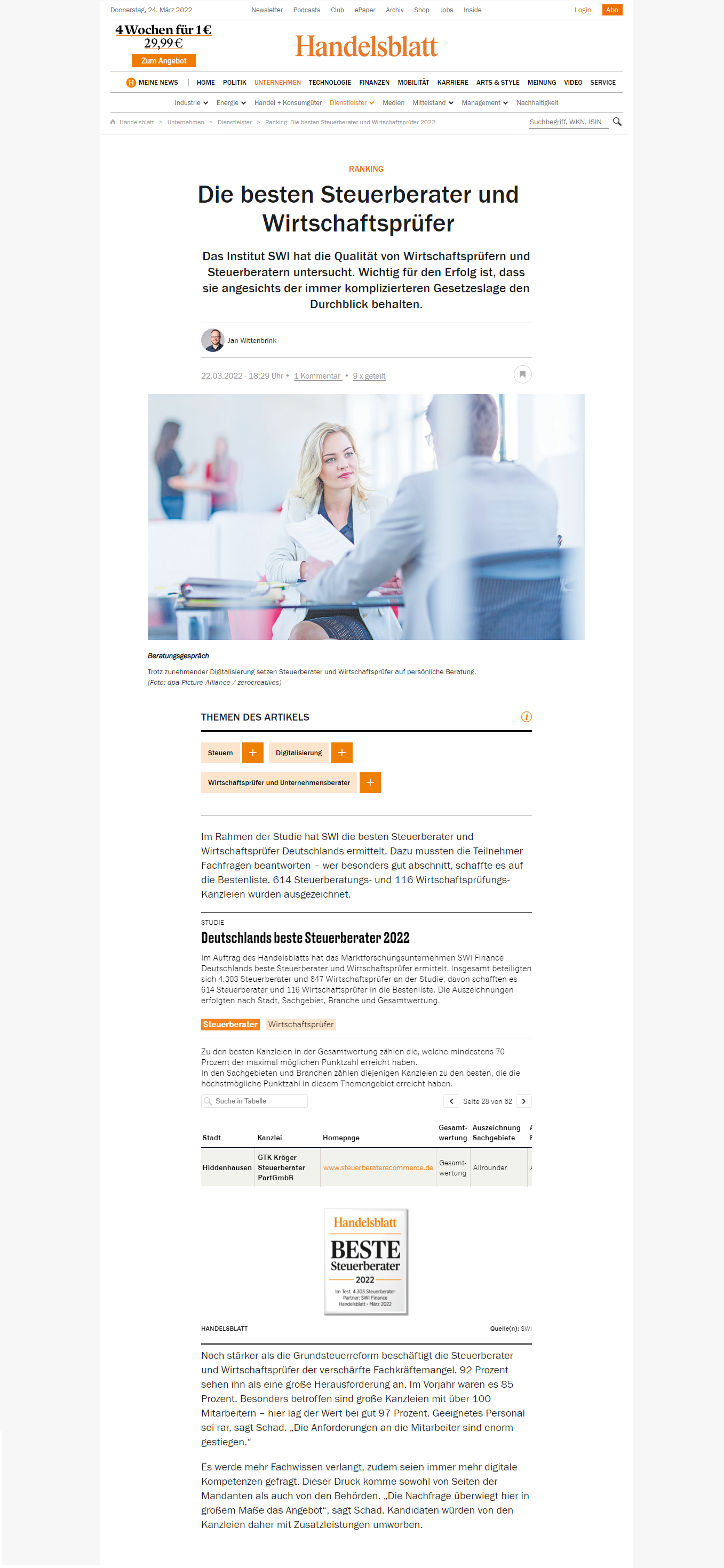 Das Handelsblatt hat GTK Kröger Steuerberater PartGmbB zu den Besten Steuerberatern 2022 gekürt.