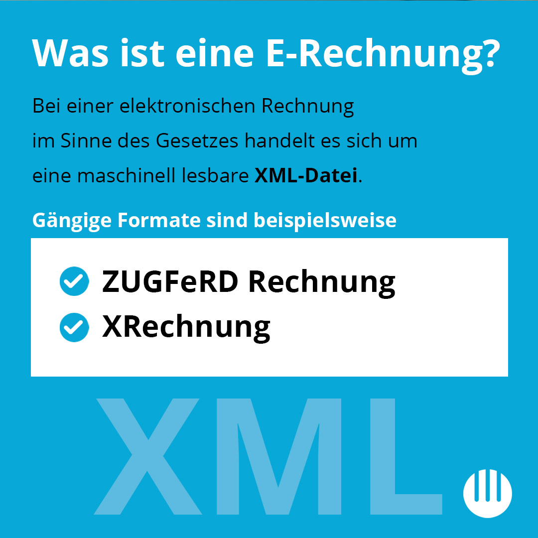 Die elektronische Rechnung muss in einem strukturierten elektronischen Format erstellt werden. Bei einer elektronischen Rechnung im Sinne des Gesetzes handelt es sich um eine maschinell lesbare XML-Datei. Gängige Formate hierfür sind beispielsweise die ZUGFeRD Rechnung oder XRechnung.