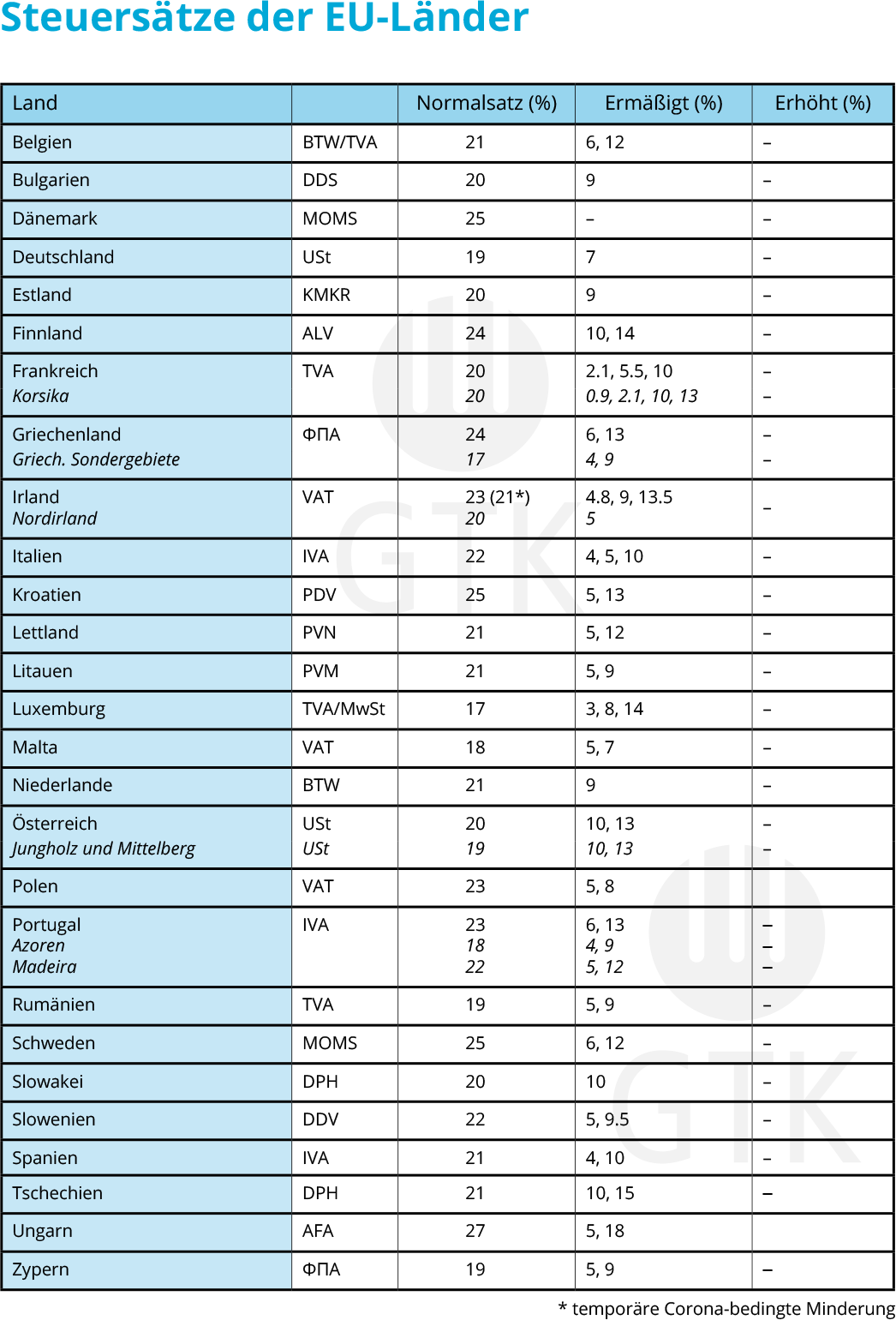 Da für viele von euch einige neue Länder und Steuersätze hinzukommen, haben wir diese in einer Tabelle zusammengefasst: → Übersicht Steuersätze der EU-Länder (Download PDF)