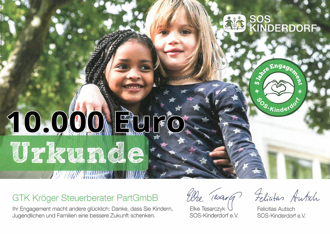 Seit 5 Jahren engagieren wir uns für SOS-Kinderdorf. Wir wollen aktiv helfen, Kinder in Not zu unterstützen. Darum hat die Steuerkanzlei GTK Kröger erneut 10.000 Euro an die Kinderhilfsorganisation gespendet.