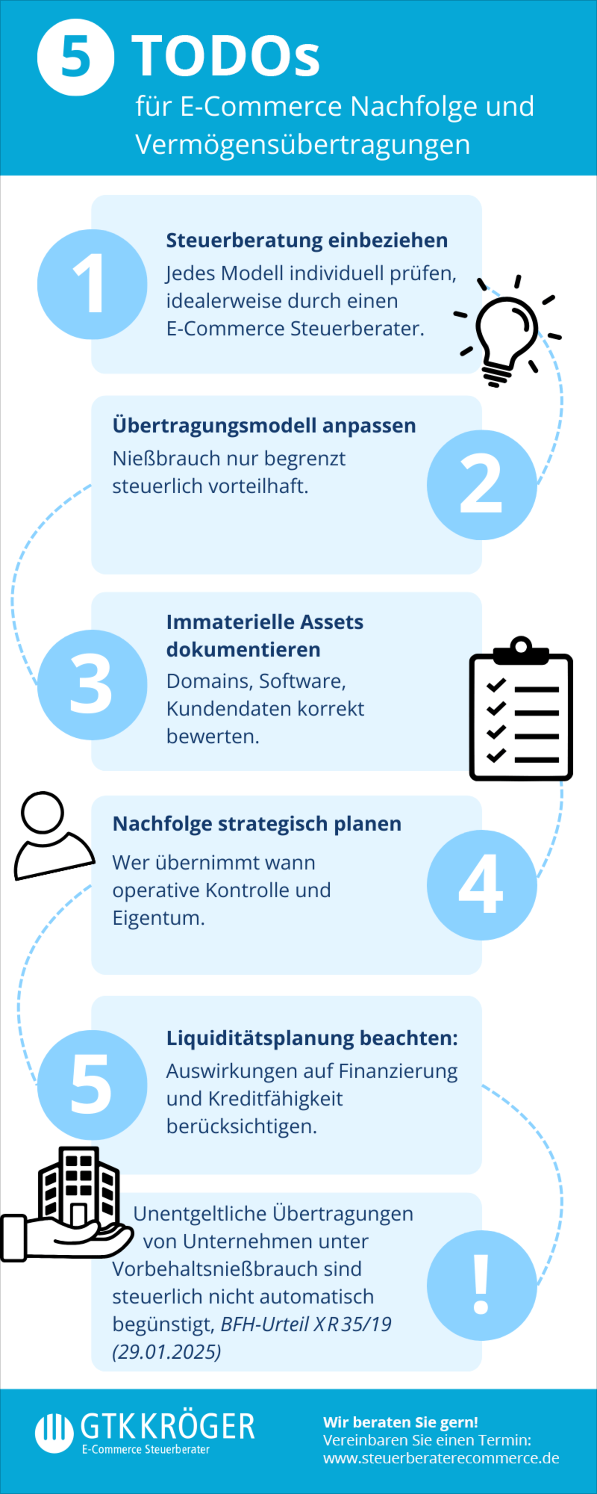 - Für E‑Commerce Unternehmen hat das unmittelbare Folgen bei Nachfolge, Schenkung und Betriebsübertragungen, weshalb die Steuerberatung durch einen E-Commerce Steuerberater empfohlen wird.