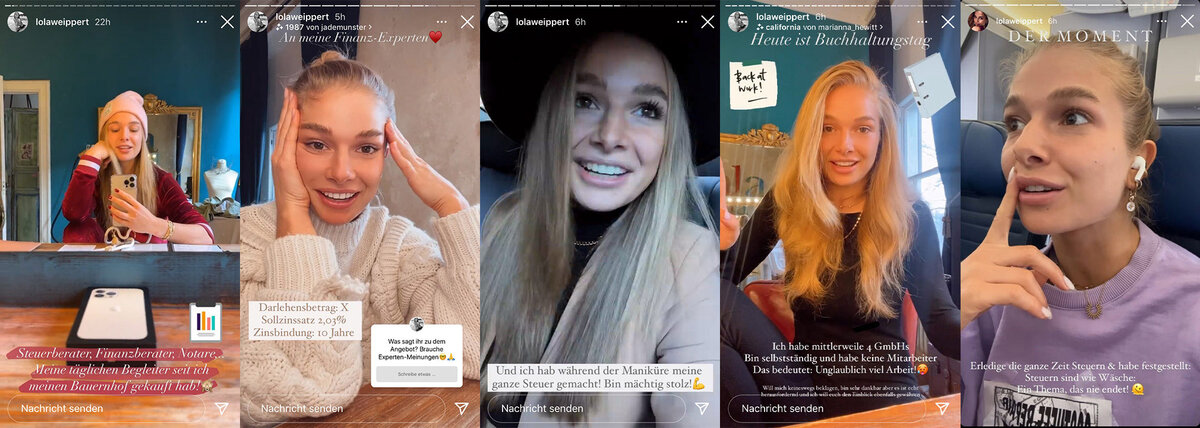 Lola Weippert (TV- und Radiomoderatorin, Influencerin, Gründerin) postet in ihren Instagram-Stories auch mal über Steuern und Buchhaltung.